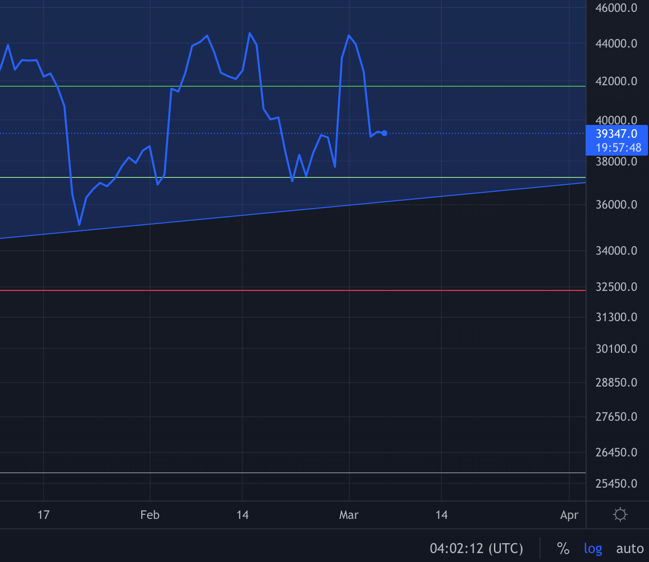 However, what tends to happen more often than not is a double or triple retest of a key Fibonnaci band in order to form a true bottom. Is it possible that the bottom of this Mandelbrot random walk is around the .382 fib of 37k? Sure. That might even make more sense since we broke it on Jan 22, tested it on Feb 2, and hit it again on Feb 21 and Feb 23.