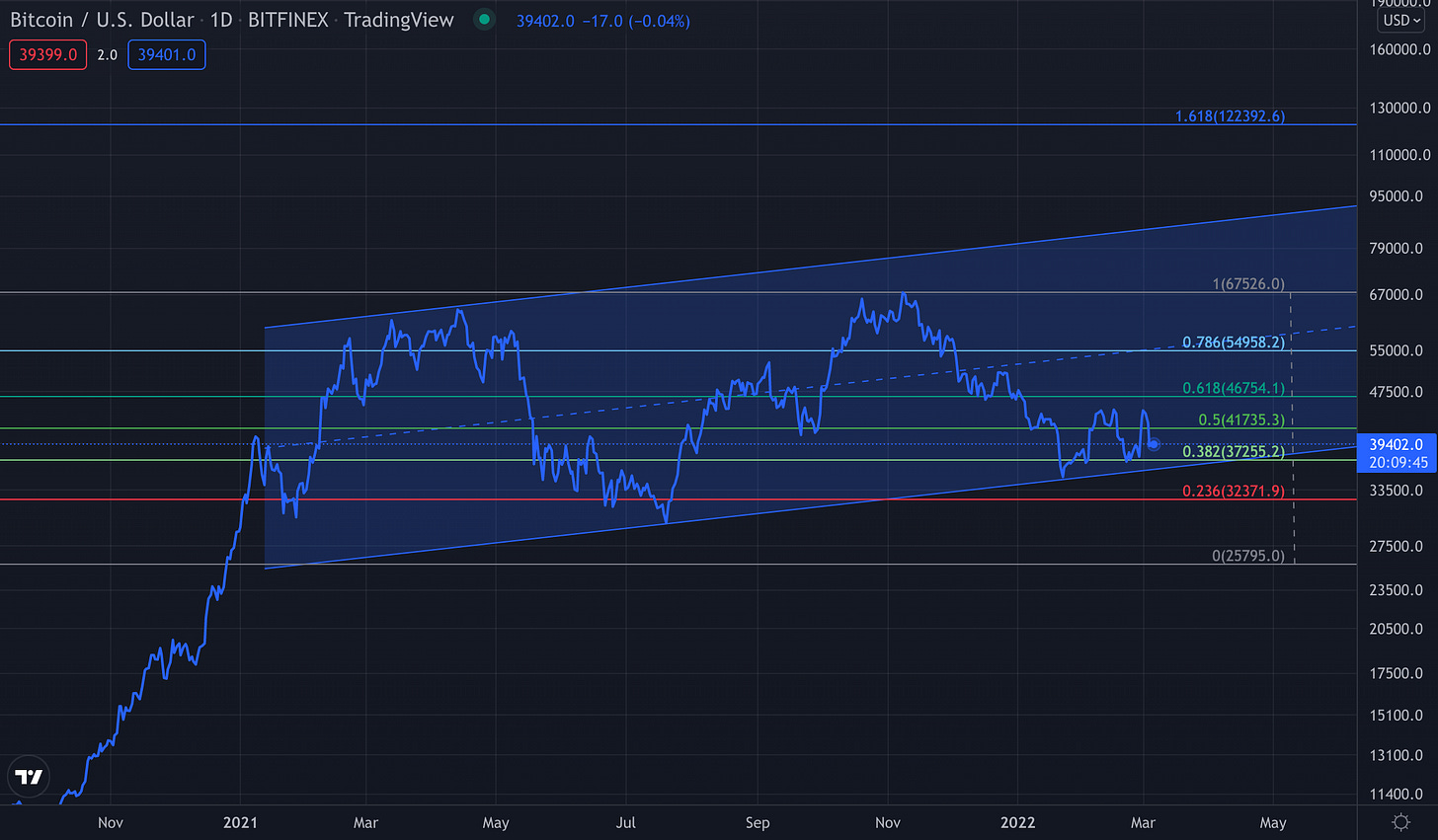 Below notice the shaded blue band called a parallel channel that I’ve drawn. This is fairly wide channel as you can see if we were to run up towards the top we would be approaching 100k — which I still think is a very real possibility in 2022 — and right now we seem to be skirting along the bottom of this channel.